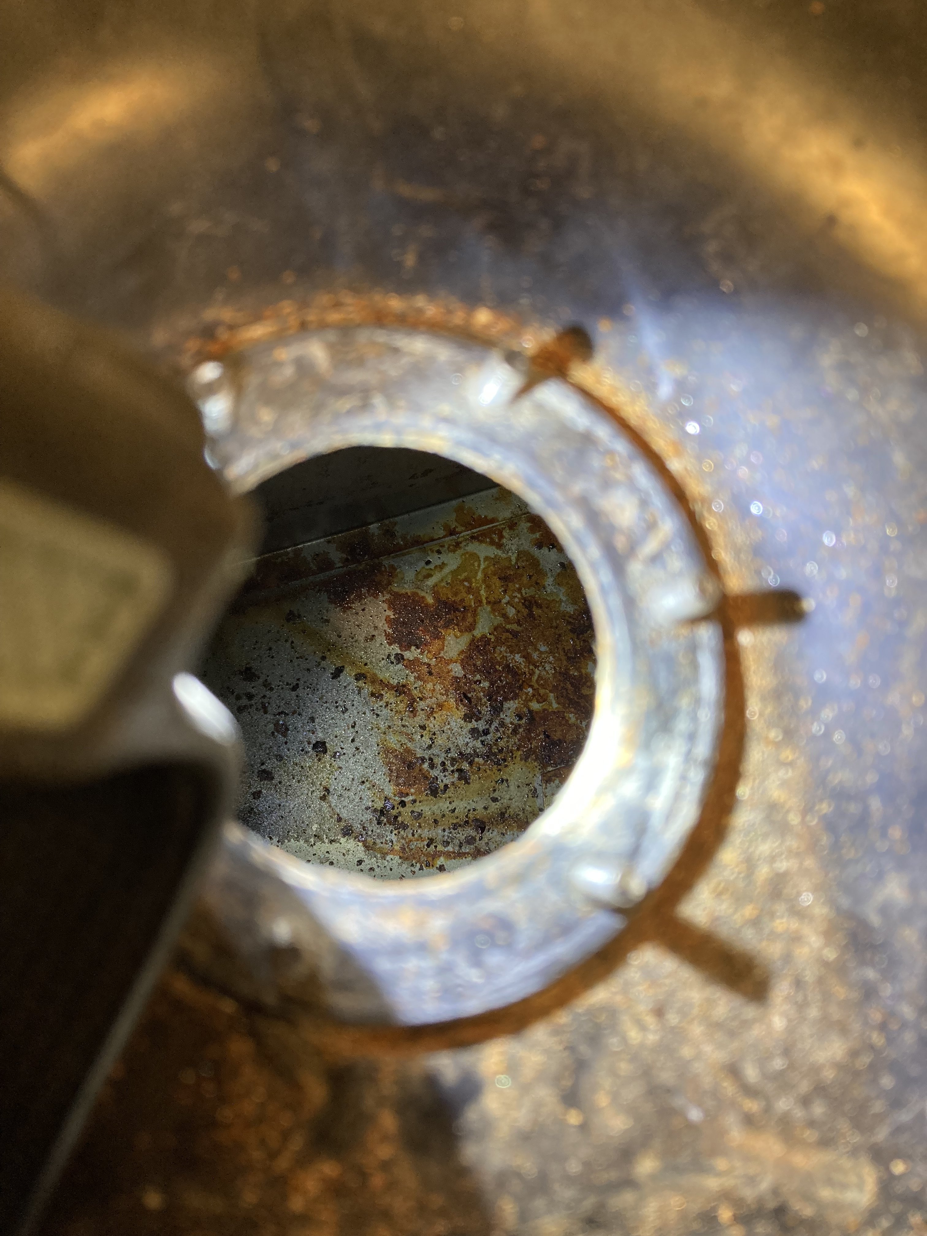 exhaust manifold: missing 2 of the 5 nuts to hold it on. Looks cracked through in the middle where it mates with the head, and like a hairline crack just underneath where the pipes join up. I would value others’ assessment:
