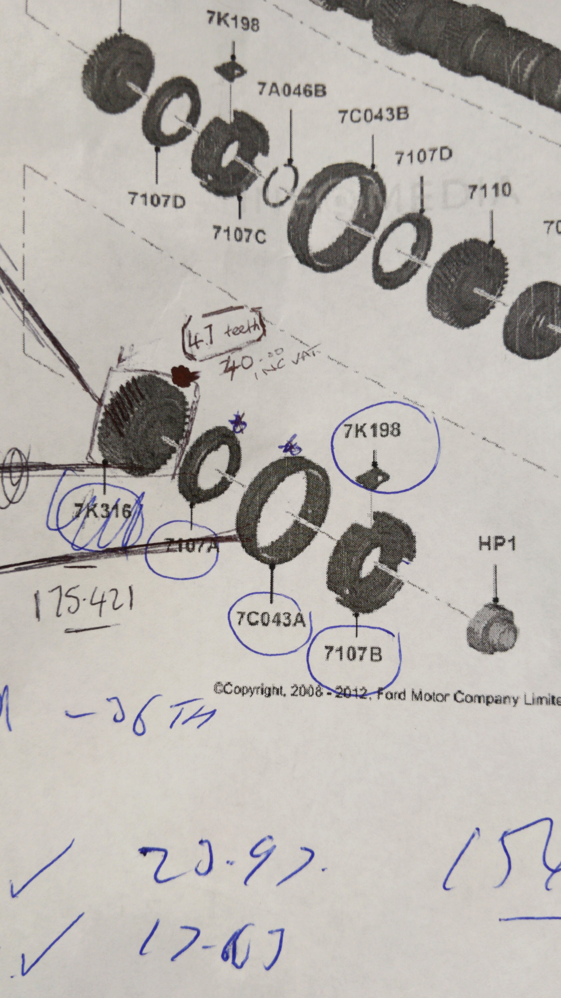 A friend of mine works at Ford and he gets Ford parts at cost price. So it hit me that i what if the Ford Ka shares the same gearbox. I've contacted him and contacted a Fiat dealer they've sent me images over of the breakdown of the parts that i need. The Ford parts which according to the images are coming at around £90 which is miles cheaper than the Fiat ones. The one issue I'm having is the 5th gear on the Ford database shows 36 teeth, whereas the on the Fiat database shows 47 teeth ok the outer cog and 36 on the inner side. The pictures on the ford sheet print out i have aren't very clear whereas the information on the Fiat is very clear. Speaking to both Ford and Fiat technicians they all seem to be saying the both the same gearbox and engine but taking to another mechanic he's advise me that the gear ratios could be different even though the casing for both look the same. I've attached 2 images of the pictures I've received. The clearer image with no writing is the Fiat database image and the other is the Ford print off. If anyone has any knowledge and any advice i would very much appreciate it as I'm struggling and if i buy from Ford they won't return the parts and Fiat are being funny about their returns policy saying make sure you're getting the right part.