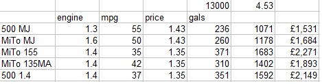 Having thought about it - if you replaced the 500 MJ II with a MiTo 1.6 MJ this has bags of torque and performance and will average 50mpg.