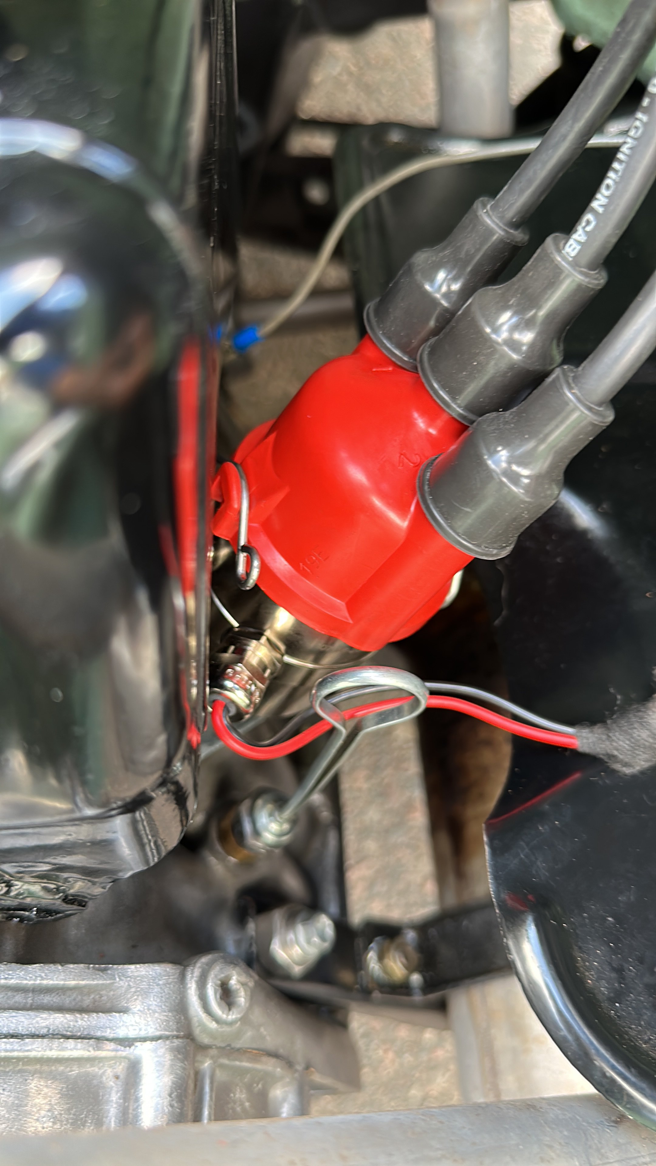 At the coil, remove the low-tension wire which connects back to the distributor; in my case, the red one: