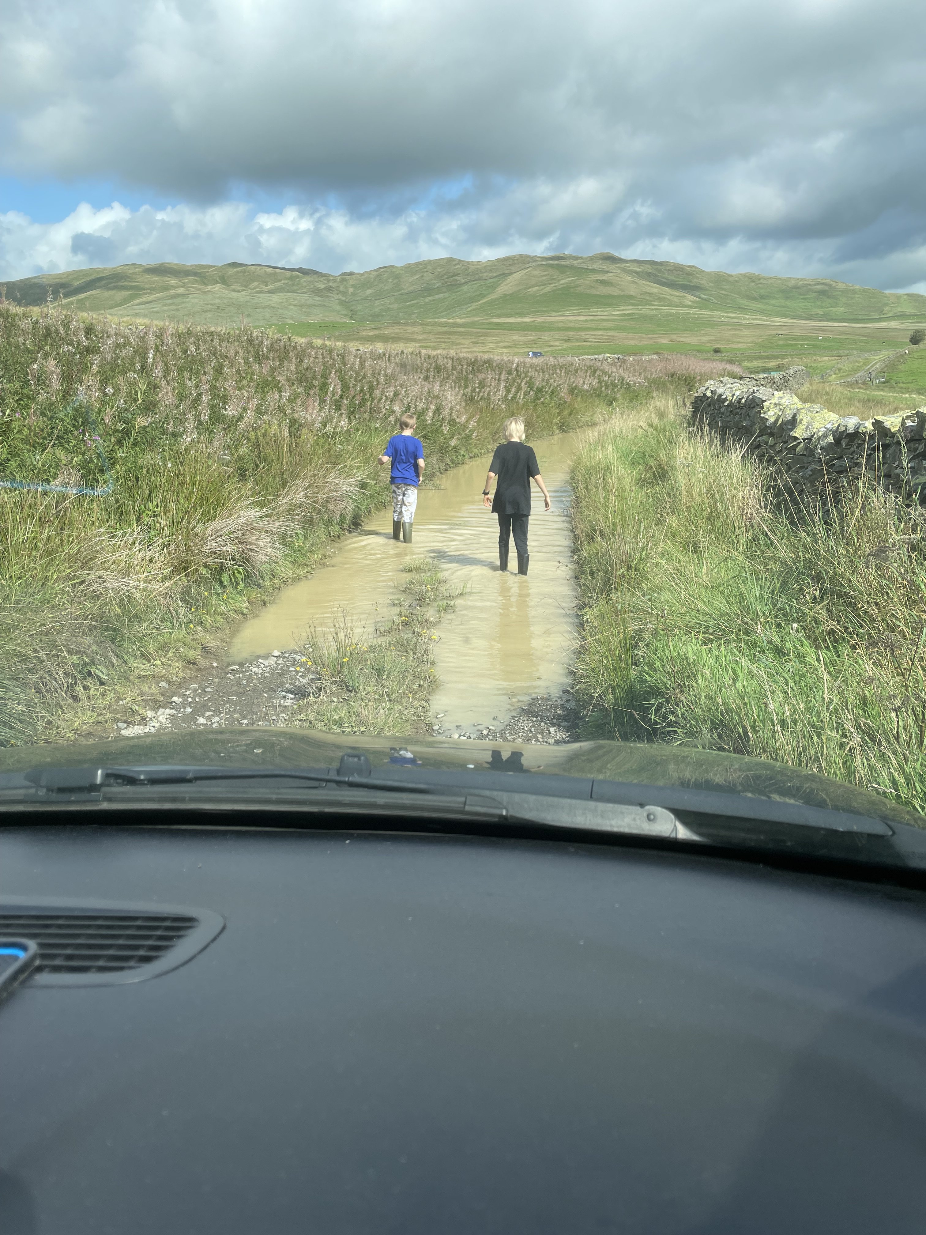 Lifting your Panda will make it even more fun for that stuff. It was only when I got to the smallish water dip at the end that I found myself wishing for more ground clearance, and realised I wasn’t going to clear the full length of the lane (only 300m left). I sent my boys in to test the height (pic below) and worried I’d get beached on the raised centre section. Doesn’t look deep here but when they got near the middle it was gonna flood wellies and the grass had started poking up in the middle again.