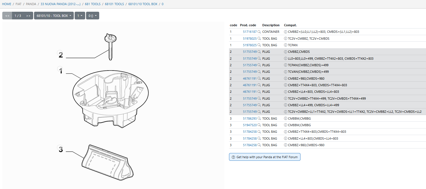 ePER is the FIAT spare parts catalogue. The link is on the bottom of the forum banner. Search window is top left of the screen. You can browse by models and categories or, which I recommend, search with the VIN number to have the parts that fit your car. In every moment you can push the 'Show all results' button below the parts list to have all of them in this category. On top of my screenshot you can find through which categories you have to go to get to this diagram / parts list.