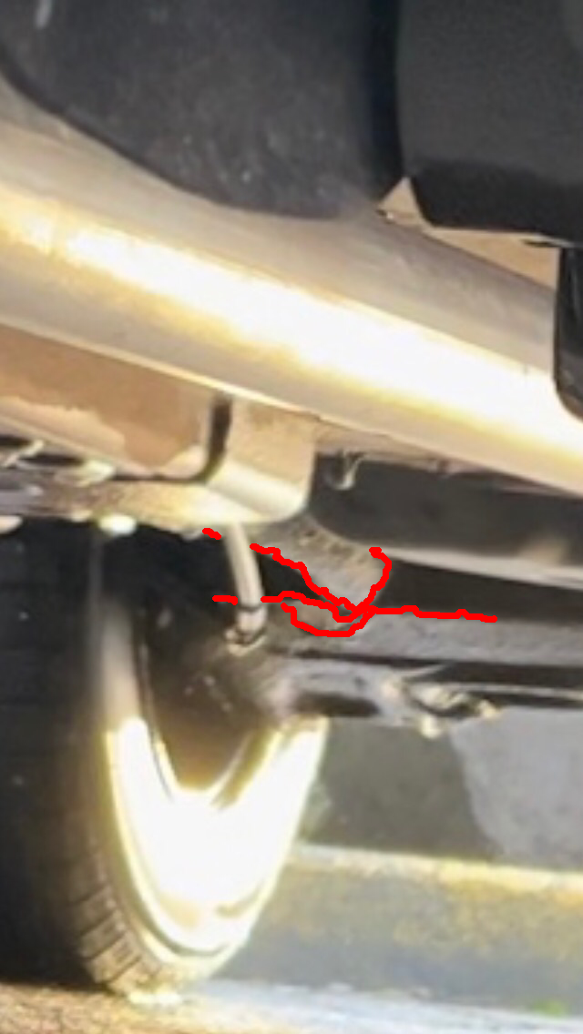 Yes, I've been puzzling about it too, doesn't look very like a shocker though/ even if the bottom eye has broken off. Then I thought, top of the picture, that rounded metal bit, that's got to be the back end of the box section? Then I realized there's a whole plastic cover missing isn't there? I remember having to remove them, both sides, to get at the front tube nuts for the flex hoses. I suppose maybe not all models have these covers though? Anyway, I just had to go out and, with her kind permission, photograph Becky's nether regions. Here we are looking aft under the driver's side sill: