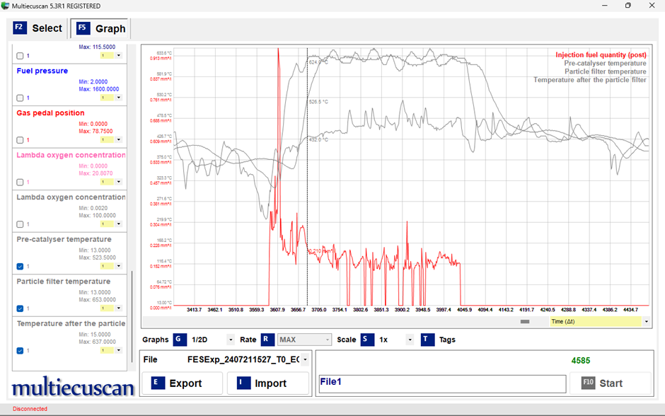 With the idle test, the injector correction values are within the FIAT tolerance – so no issue there. Taking into account that it has failed regen and had a forced regen in the recent past, there still appears to be something wacky with the DPF regenerations.